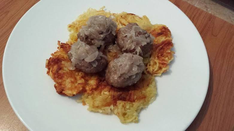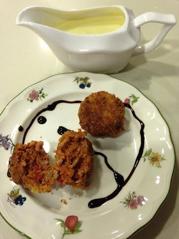 Nidos de patatas paja con mini huevos de hambuguesa con cebolla caramellizada