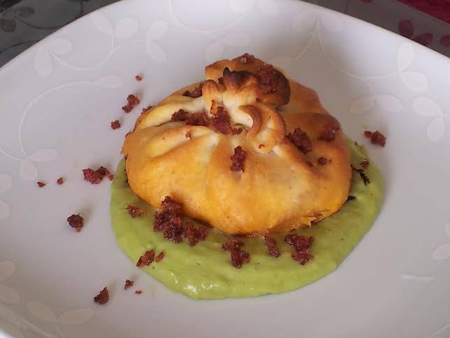 Colocamos en el plato con ayuda de un cucharón, una cucharada de crema de guisantes y encima un saquito, espolvoreamos con las virutas de jamón…y listo!!