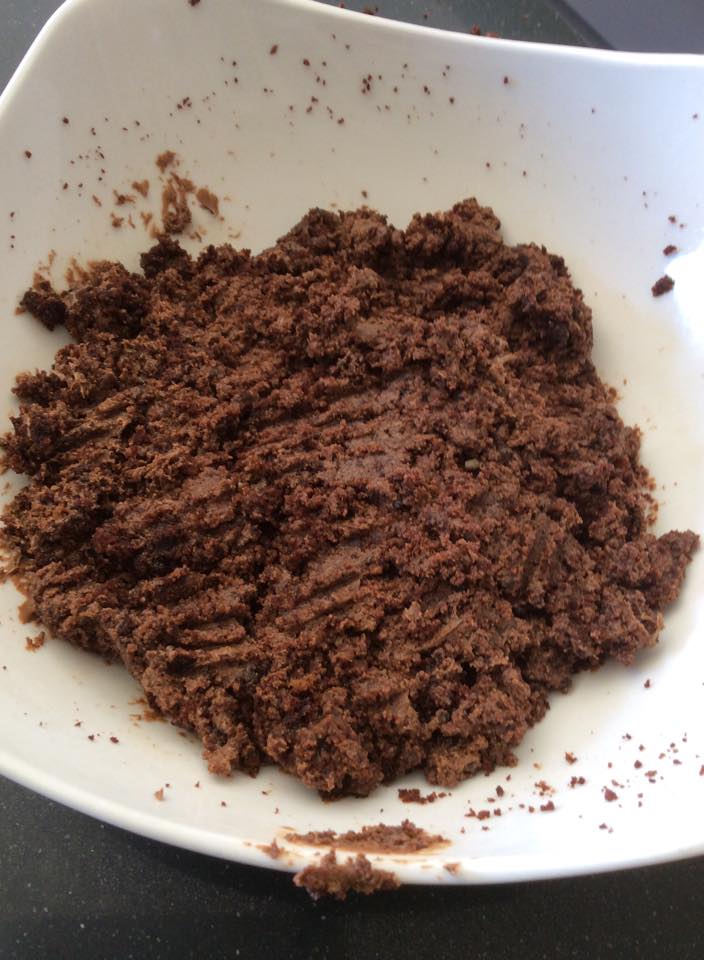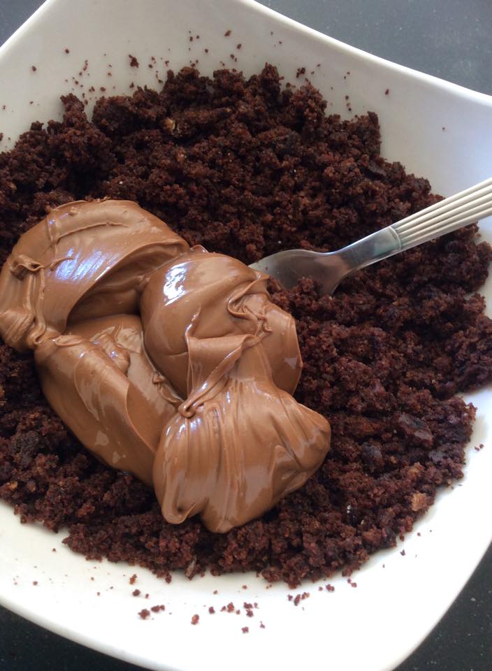 - Agrega la crema de chocolate y un chorro del licor que hayas elegido, pero sin pasarte, no queremos que quede tan liquida la pasta que sea imposible manejarla. Para que tengas una idea de las proporciones, por cada 3 cucharadas de migas del bizcocho, debes agregar una de nocilla