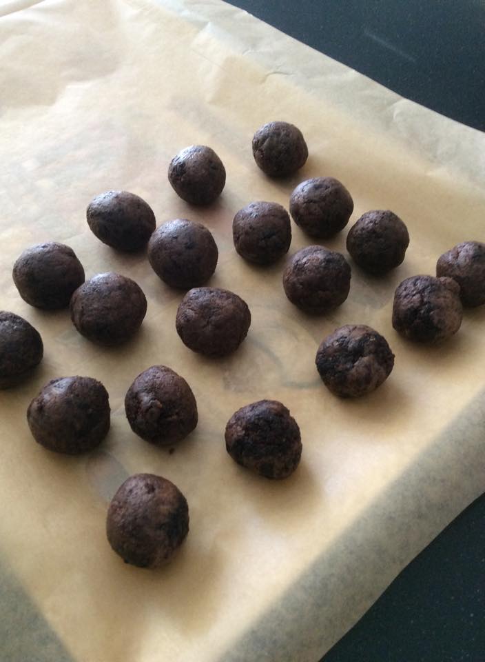 - Pasado este tiempo mínimo, comienza a trabajar la pasta, dandole forma de bolitas, como si hicieras albóndigas, ¡pero mas entretenido! Ponlas sobre papel vegetal en una bandeja que quepa en la nevera