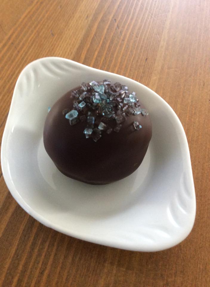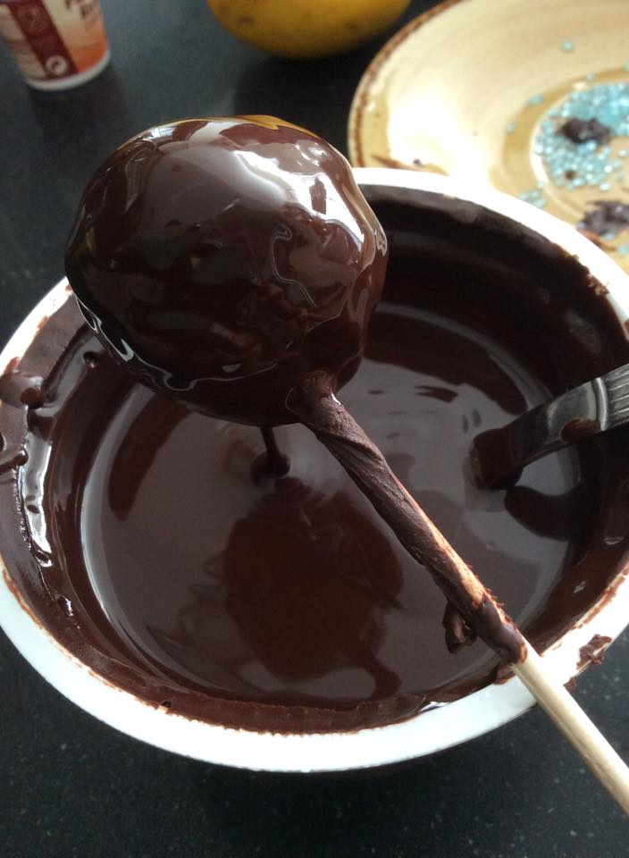 - Pincha una bolita con un palillo y sumérgela en el chocolate…¡que preciosidad! Ayudándote con otro palillo, sostén el pop cake unos segundos para escurrir lo máximo posible el chocolate sobrante…y lo apoyas suavemente en la bandeja. Ayúdate con otro palillo para desprender el primero, con suavidad y paciencia. Espolvorea con los fideos de chocolate y deja secar tranquilamente…no te preocupes, ¡quedarán muy bonitos!