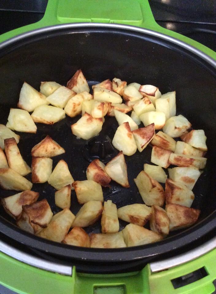 El primer paso, pelar las patatas (en este caso, de la variedad Marabel) y cortarlas ya sea en bastones o en dados, como en este caso….una cucharada de aceite, remover bien para empaparlas y a la Cecofry durante 30 minutos: