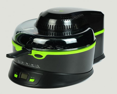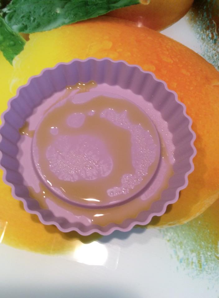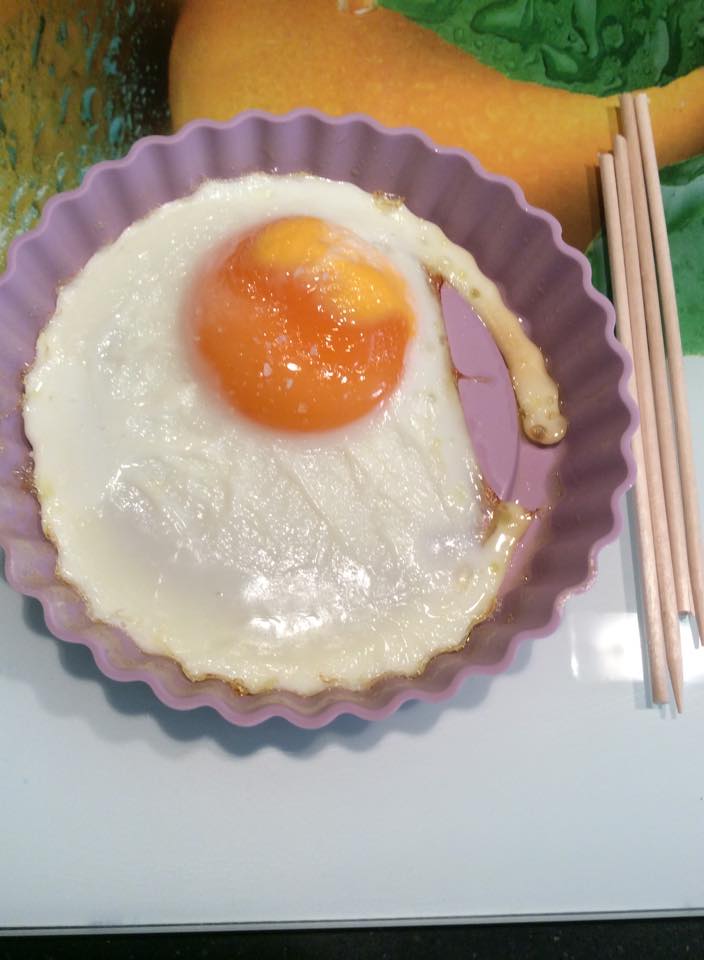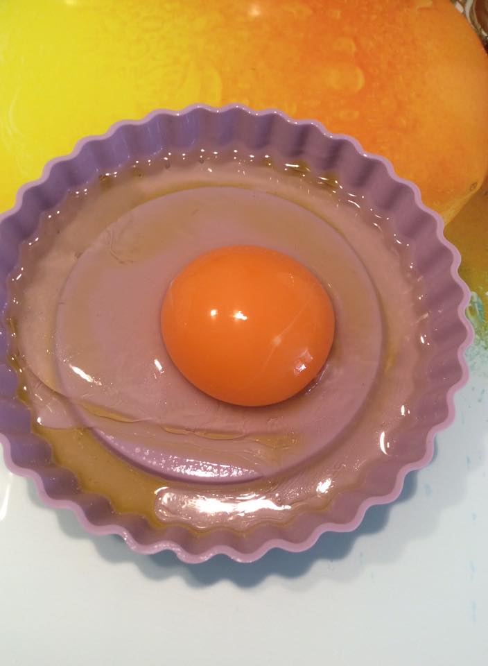 - Empiezo con el huevo…pienso en la yema rompiéndose sobre el pan tostado…una vez puesto en el molde de silicona (unos estupendos que son para tartaletas individuales) va a la Cecofry, unos 3 ó 4 minutos aproximadamente, sobre la rejilla, y en el espacio que sobra, las dos primeras rebanadas de pan de molde comienzan a tostarse
