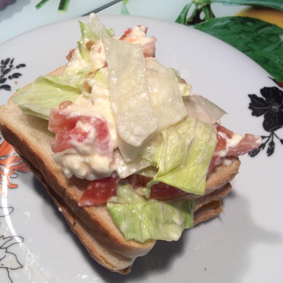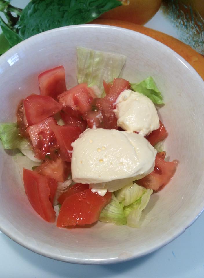 - Mientras el huevo va cuajando, saco lechuga en tiras, ya limpia y que suelo guardar en bolsa para la hora de hacer la ensalada…un poco de tomate en dados, una cucharada de mayonesa y ya tengo otro piso del sándwich